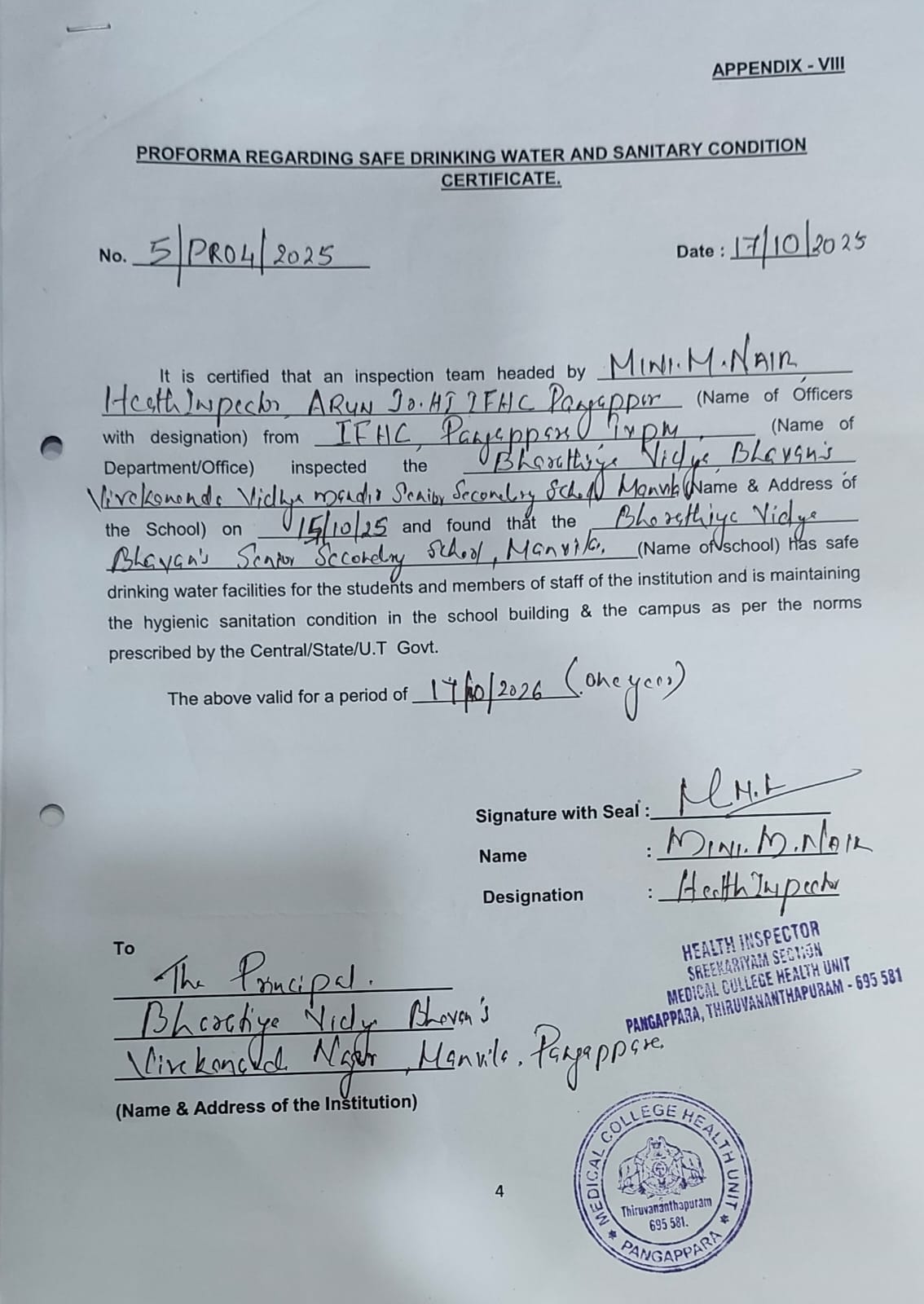 | 4 | 4. | COMPLETE ADDRESS WITH PINCODE | BVB VIVEKANANDA VIDYA MANDIR SENIOR SECONDARY SCHOOL, MANVILA, PANGAPPARA P.O , THIRUVANANTHAPURAM, PIN-695581 |